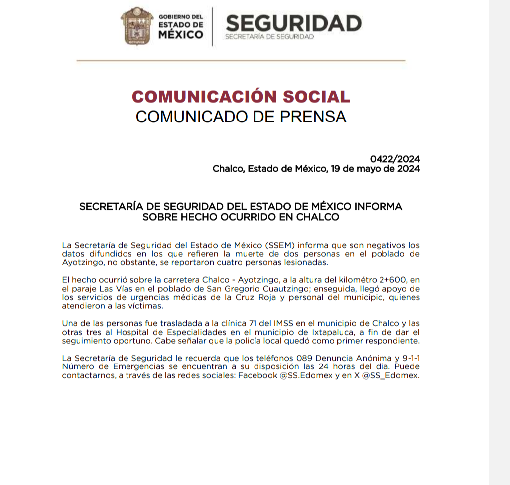 La Secretaría de Seguridad del Estado de México (SSEM) informa que son negativos los datos difundidos en los que refieren la muerte de dos personas en el poblado de Ayotzingo, no obstante, se reportaron cuatro personas lesionadas.