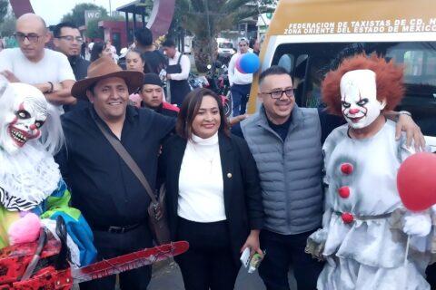 Nezahualcóyotl, Méx. 3 noviembre del 2024. Líderes de transporte público de Pasajeros de la asociación Rutas Hermanas realizaron la entrega de dulces y juguetes durante